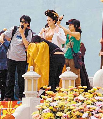 当日巩俐身着低胸皇后服,完全符合唐朝宫廷贵妇的设计,而巩俐原本丰腴的身材更得以完全地展现,而相伴她身边的全部都是同样服饰风格的“宫女”。在金黄一片的花海中,巩俐登上花台成功加冕。在花海的下方,大批宫廷卫士见证了这个盛大的仪式。整场戏实现了张艺谋和巩俐之间的默契,站在台下指挥拍摄的张艺谋很少走到巩俐身边“教”戏,仅仅在远处打一个手势,就能让巩俐领会到镜头的要求。 (记者刘嵩)