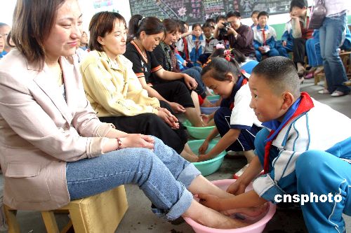 5月10日,在济南市港沟镇实验小学的学生们正为自己的妈妈洗脚。当天,该校学生开展了“感恩母亲节”系列活动,感谢母亲对自己的养育之恩,并表达对母亲节日的祝福。作者:龚辉