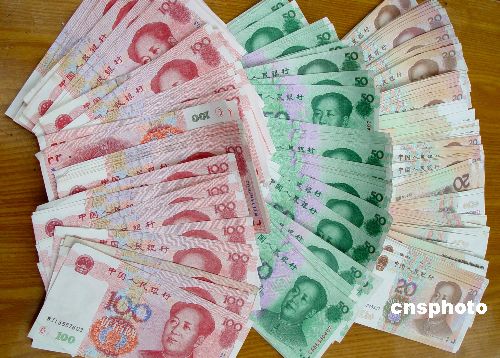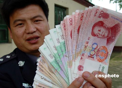5月9日,民警在展示缴获的部分假币。近日,山东莘县警方破获一起购买、使用假币案,正在使用假币消费的王某(女,58岁)及其子谢某等四人当场被抓获,民警随即从该四人身上搜出假币4610元。经查,该四人从2005年4月起,先后多次从河南台前县以1:10的价格购得假币共计3万余元,分别在山东莘县、河北馆陶县等农村集市上消费,从中非法获利。作者:沈书增