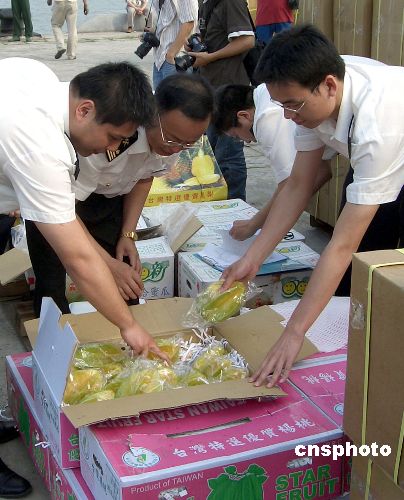 五月十一日下午,两艘运载着第八届海峡两岸经贸交易会(简称海交会)参展台湾农产品的货轮到达福州马尾对台小额贸易监管码头,这是将于本月十八日举办的本届海交会第一批台湾参展品,其中包括柠檬、柳橙、哈密瓜三种新增准入的台湾水果。图为马尾海关关员正在查验货物。作者:张鲁榕