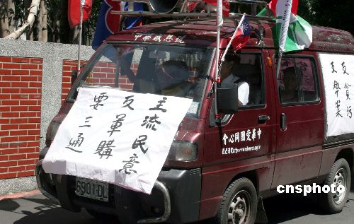 五月十二日是台湾岛内蓝绿阵营就两岸关系条例直航修正案对决的关键时间,民间团体“中华爱国同心会”自发开着宣传车在“立法院”外巡游,车上贴着“主流民意、反军购、要三通”的标语。作者:张量