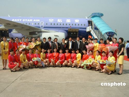 5月14日,一架印有“东星航空”字样的紫罗兰色A319型空中客车飞机,平稳地降落在武汉天河国际机场。至此,总部位于武汉的华中地区的首家民营航空企业——东星航空公司迎来了第一架全新客机。图为东星航空公司领导、空姐与空客飞机合影留念。作者:徐金波