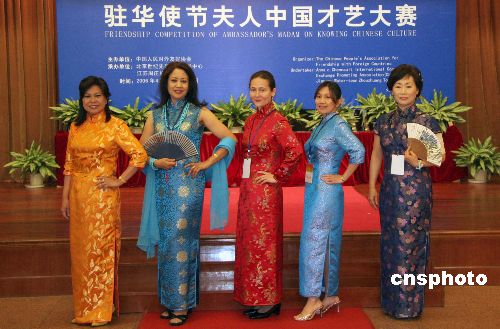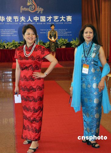 五月十四日,首次举办的“二○○六驻华使节夫人中国才艺大赛”在北京举行中式服装旗袍表演赛,二十位参赛使节夫人参赛,图为参赛选手身着主办方为其量身定制的中国旗袍,在赛场的舞台上精彩亮相、走秀。作者:孙自法
