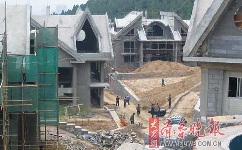 5月11日,该报记者沿着燕子山路西坡,穿过浓郁茂密的树林,进入一个天价别墅区——汇雅·燕子山庄。这里一片忙碌的施工景象,14栋别墅框架结构已经建成,整个别墅区紧靠风景秀丽的燕子山凿山而建,自然环境极为优美。