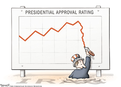 中新网5月15日电 美国总统布什的持续率持续下降。不仅在伊战等国际问题上连连失分,在国内问题上,由于多数美国民众不赞同布什政府的移民以及和能源政策,造成布什的支持率一路下跌。(漫画来源:美国《基督教科学箴言报》)