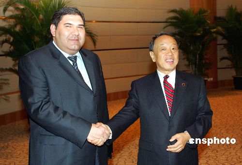 五月十五日,中国外交部部长李肇星,在上海会见出席2006年上海合作组织成员国外长理事会例行会议的乌兹别克斯坦外长加尼耶夫。作者:汤彦俊