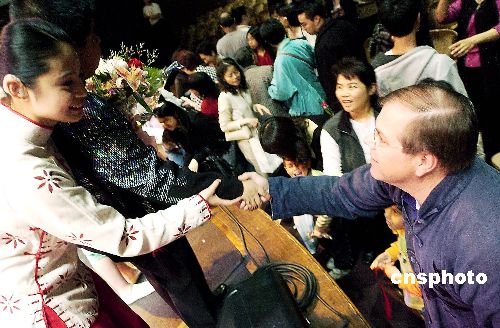 五月十四日晚,正在美西进行巡回演出的中国残疾人艺术团在旧金山举行第二站《我的梦》演出结束后,一位白人父亲带着儿子向演员表示祝贺。作者:陈钢