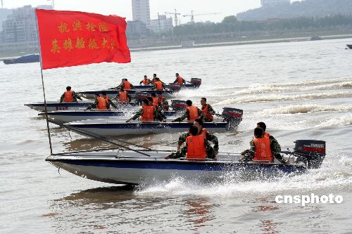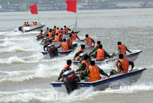 2005年5月15日,武警湖北总队防汛抢险突击队在武汉长江水域进行水上抢险演练。为做好今夏防汛抢险工作,该总队从人员、物资装备、技术等方面充分准备,确保抗洪抢险任务的圆满完成。作者:宋建春