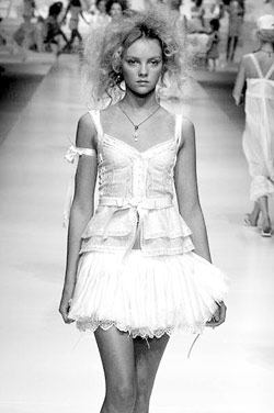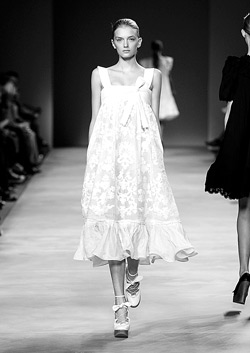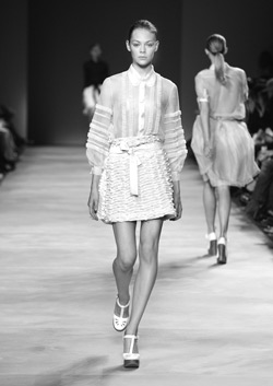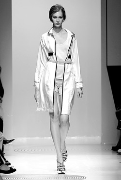 时尚点评:这一季的透明质感的白衣大多拥有“浪漫”的特点,带着地中海浪漫风情的同时还带有上世纪七八十年代少女服饰的影子。另外,白色透明服饰的互相搭配也为性感加分,比基尼加上白纱的长外套,性感之极的同时和今年的休闲风也相得益彰。