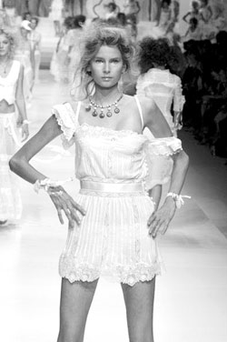 伴随着2006年春夏白色大行其道,美宝莲、封面女郎、欧莱雅资生堂等许多著名的彩妆品牌都纷纷推出了强调眼部和唇部的热门的裸妆,在服饰白色风潮的影响下,白眼线、白眼影都成为最“潮”的打扮。