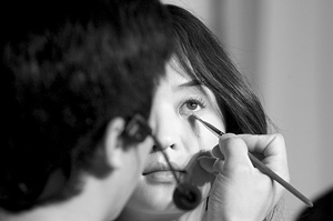 眼妆:用淡金色或银白色眼影晕染在眼睛的四周,下眼睑加上白色,能较好强调眼部。