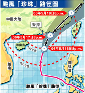 中新网5月17日电 据香港媒体报道,香港天文台在今日(十七日)上午七时十五分改发三号强风信号。另据星岛日报报道,台风“珍珠”来势汹汹,预计今日午后最接近香港。