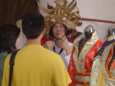 记者按工作人员所指,终于在秦王宫边上找到魔幻王宫,如今它已成为一个热门的景点。王宫保存相当完好,朱红色的人像、金色飞龙、金扇子、白祭台都原貌重现,甚至于许多当地人在王宫里做起生意,穿“鲜花盔甲”拍张照15元,穿张柏芝的“白天鹅绒服”拍照要20元,生意相当不错。王宫里甚至有家影院,常年播放《无极》。相比这边的热闹,与魔幻王宫一墙之隔、拍摄《寻秦记》的汉街却门庭冷落。一个导游称,魔幻王宫今年3月开张,游客都必到此一游,而且相当满意。