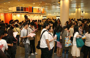 香港劳工处昨日(十六日)起一连两日在中央图书馆举办大型招聘会,共提供八千二百多个职位。首天招聘会共吸引八千名市民进场,而招聘未正式开始,已有大批市民在场外等候,大会需要提前半小时开放予市民。