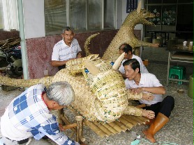 最近在社区理事长的邀请下,他们中的一些人再度出马,制做今年狗年的大型竹编狗,他们花了近1个月的时间采竹子、剖竹片、绘图,再耐心编织狗的头部、躯体、尾巴和四肢,另有木头刻狗的舌头、耳朵和爪子等,完成比人还高的两只竹编大狗。