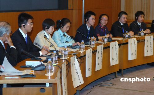 应邀访日的中国高中生代表团,五月十七日在东京开始首个访问日程。图为学生们与新中日友好二十一世纪委员会日方委员就新世纪中日关系发展举行对话会。作者:王健