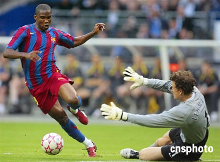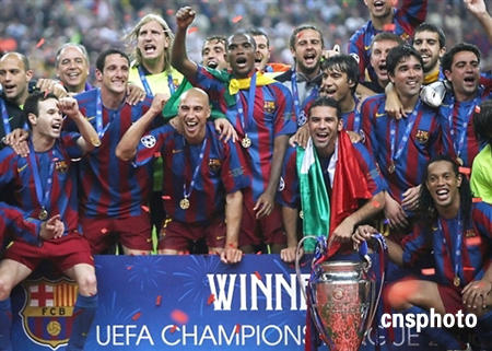 中新网5月18日电 欧洲冠军联赛北京时间今天凌晨进行了决赛,西甲冠军巴塞罗那队在落后一球的不利形势下,利用对方门将被罚下的良机,在下半时五分钟那连入两球将比分反超,以2比1击败对手夺冠。