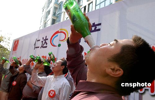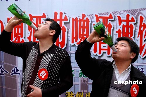 2006年5月中旬,安徽滁州举办啤酒速饮大赛,47名“酒坛英雄”参与比拼,争做“啤酒王子”。此次啤酒速饮大赛采取吹瓶式,并按照国际评判标准,以一分钟喝啤酒多少分胜负,经过初赛、复赛淘汰,在四组中决出前6名选手进入决赛。作者:王家国