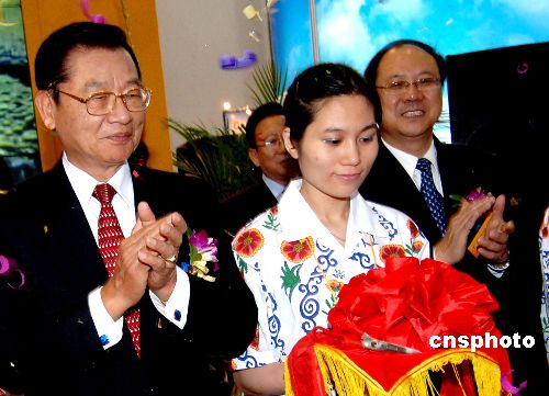 五月十八日,为期五天的第八届海峡两岸经贸交易会、第三届中国福建商品交易会在福州金山展览城隆重开幕。国台办副主任郑立中(右一)、中国国民党副主席江丙坤(左一)共同为第八届海交会“澎湖馆”开馆仪式剪彩。作者:刘可耕