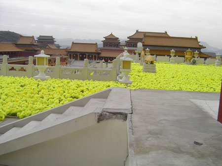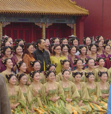 中新网5月19日电 张艺谋每一部片子都令人关注,海峡都市报消息,近日,记者加入《黄金甲》探班大军,一次偶然的机会走进片场,为读者献上《黄金甲》横店片场主创人员的第一张曝光照:宫女丛中张艺谋。