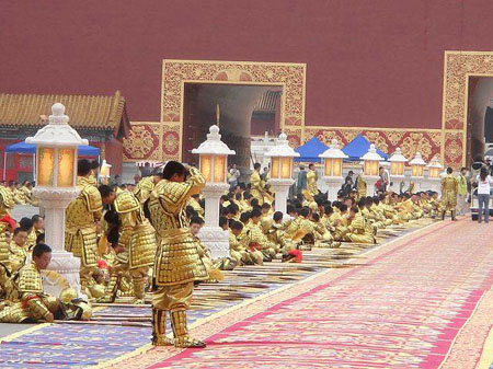 张艺谋一般都在帐篷下的荧屏前,拿着大喇叭发号施令,在拍戏中他很少离开帐篷。那天张艺谋在宫女的要求下,答应在广场上合影。当时带队老师先叫宫女排好队,迎接张艺谋。面对宫女们的热情,在一起拍照时,张艺谋有意识地脱掉自己的帽子,表现出一种对他人的礼貌和尊重。张艺谋这一幕让人感受到这名艺术大师最真实的一面。