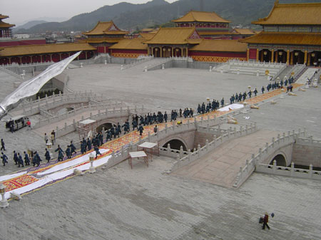 在片场最抢人眼球的宫女,身着低胸装,个个长得美丽丰满。据悉这些女孩多数来自杭州高校,是通过选拔才有资格当群众演员的。而她们唯一的要求是和张艺谋合影。这么低的要求张艺谋当然不可能拒绝,毕竟这拨漂亮女孩为了这部戏,承担着走光的危险。
