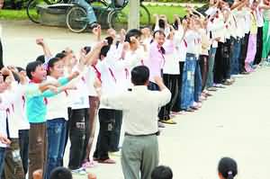 还未进江寨小学,记者就听到风中传来一阵稚嫩的呼喊声:“欢迎,欢迎,热烈欢迎……”两队小学生正在老师的指挥下面对面地站着,几十只小手高举,不断做出挥舞鲜花的动作。原来他们正利用课余时间排练欢迎江丙坤的仪式。