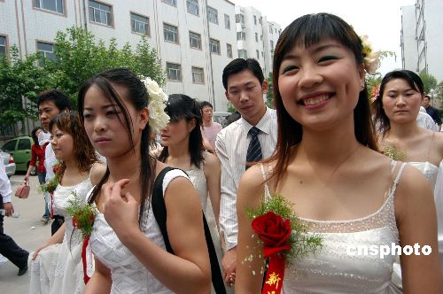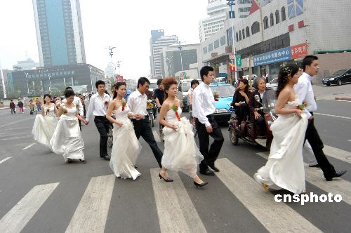 5月18日,山东潍坊50对准新人参加了由“潍坊名门婚纱影楼”组织的婚礼“预演”。这项国内罕见的创举,受到了许多准新人的欢迎,报名十分踊跃。作者:王志德