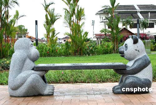 五月十八日,东马来西亚沙捞越州首府古晋的“马中友谊花园”正式落成,沙捞越州首席部长阿都泰益主持开园仪式。该园为庆祝马中建交三十周年而建。图为园内妙趣横生的雕塑“大马人猿与中国熊猫对弈”。中新社发 苏祥新 摄