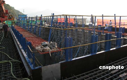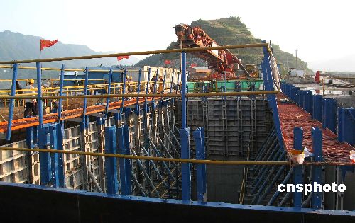 五月十八日晚,三峡大坝最后一仓混凝土将拉开浇筑序幕。目前还剩仓面面积三百七十七点四平方米,混凝土浇筑量一千零一十七点五立方米,预计二十日十时完成浇筑任务。此举表明,举世瞩目的三峡工程土建项目全面进入收尾阶段,雄伟的长江三峡大坝即将全线建成。图为等待验收合格后,准备浇筑的最后一仓。中新社发 艾启平 摄