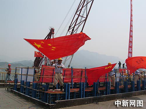 中新网三峡工地五月二十日电 题:五星红旗飘扬在三峡大坝坝顶