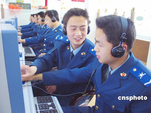 驻济南空军某部党委投资新建大型综合文化活动中心,统一购置电脑,并将20余类、近万册电子光盘精品图书通过局域网连通到基层连队。2006年5月20日,该部官兵利用周末在电子阅览室学习。中新社发 耿国庆 摄