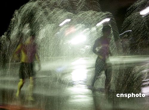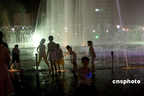 5月20日晚,安徽淮北市民在中泰广场感受喷泉带来的清凉。当日,台风“珍珠”过后,安徽大部分地区气温陡然抬升,淮北最高气温达到34摄氏度。中新社发 王璋闻 摄