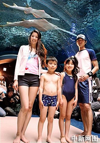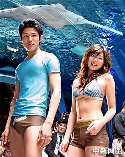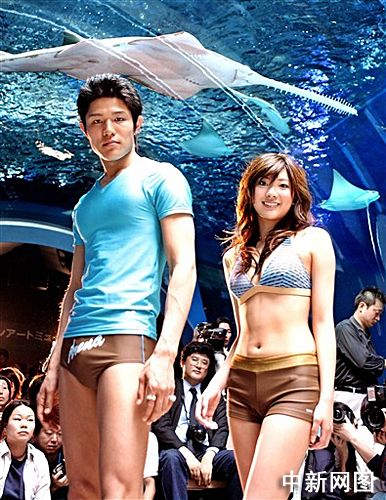 2006年5月22日,模特们在日本东京一家水族馆展示由日本著名运动服制造商迪桑特(Descente)设计的泳装。 迪桑特将开始研制一系列高科技材料制成的快速干燥及防紫外线服装。(法新图)