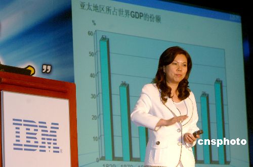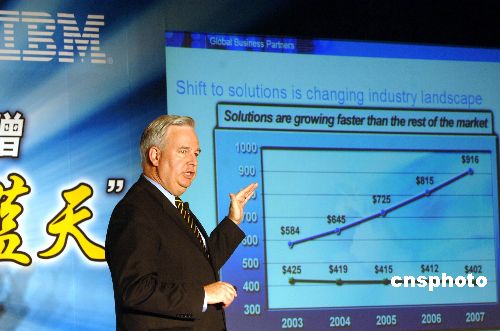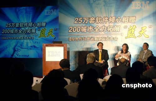 五月二十二日,蓝色巨人IBM在北京举行新闻发布会宣布:IBM正式推出“蓝天计划”,拓展中国大中小城市的场,带动新的业务增长。这是自出售个人电脑给联想后,其售后服务及合作伙伴的一次大型重建计划。该计划为全新的IBM售后服务系统组建全新的百人团队,将向客户及合作伙伴送出二十五万套IBM软件特惠包。中新社发 韩艺冰 摄