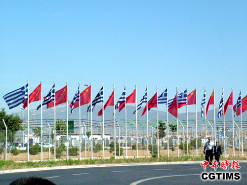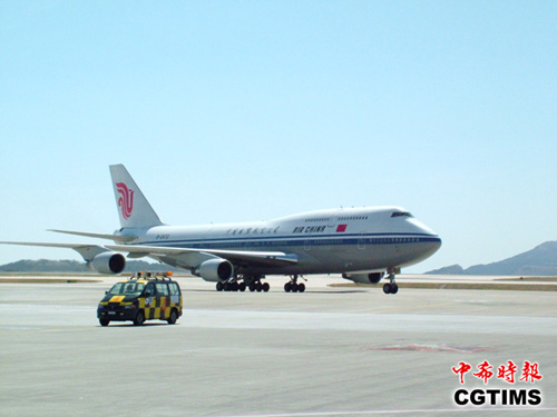 当地时间上午11时许,吴邦国委员长乘坐的专机徐徐降落在雅典国际机场。机场上中希两国国旗随风飘扬。吴邦国委员长和夫人章瑞珍走出舱门,向欢迎的人群挥手致意,并与前来迎接的希腊议会第一副议长哈齐加基斯等希腊高级官员一一握手,互致问候。中国驻希腊大使馆青年向吴邦国委员长和夫人章瑞珍、全国人大常委会副委员长热地敬献了鲜花。