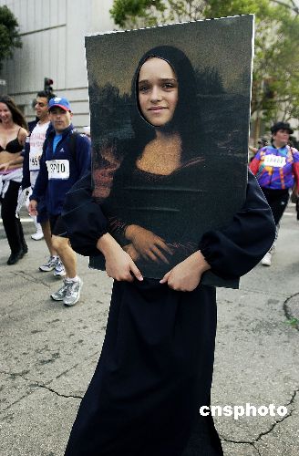 新潮的美国旧金山人以装扮奇特而著称。图为一名子女将自己打扮成电影《达芬奇密码》的人物,为五月中旬上映的这部电影助兴。中新社发 陈钢 摄