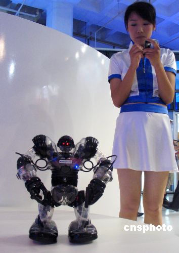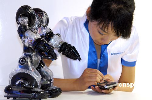 2006年5月23日上午,第九届科博会联想展区展示的一款“蓝牙机器人”。据了解,用户可以通过联想ET980手机的“蓝牙功能”控制这款机器人跳舞、说话和录音。 中新社发 吴芒子 摄