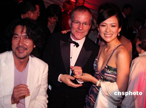 寰亚电影投资一亿六千万港币的2006年度大戏《夜宴》于5月22日晚,在法国康城电影节(或称<康城>) Majestic Beach 举行“海边派对”,寰亚电影老板林建岳先生率《夜宴》导演冯小刚、演员章子怡、周迅、吴彦祖等出席。《夜宴》在法国康城影展上举行记者会,各地传媒非常踊跃,特别关心电影拍摄过程。有传出章子怡的美国经理人公司曾施压不批准她出演《夜宴》,章子怡直言确有此事,因当时经理人公司想她多抽时间为另一部戏做宣传,不过她看过剧本后很喜欢,觉得能以母语去演戏她会得心应手,更加上其父母是冯导的影迷,也曾对她讲过能拍冯导的电影会是一件美事,所以她不理美国经理人公司的想法,仍坚持演出。图为《夜宴》康城派对照片。 中新社发 钱兴强 摄
