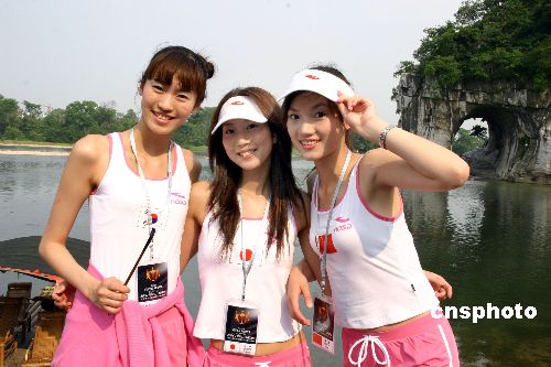 5月22日下午,参加广西电视台2006亚洲超级模特大赛的45位中日韩模特在桂林漓江边象鼻山旁进行外景拍摄,在中国著名画家陈中华的指导下,她们开心地学习中国画。中新社发 骆文刚 摄