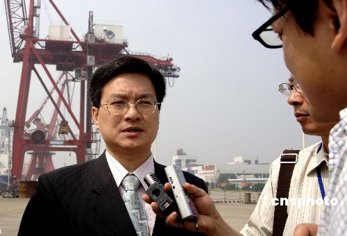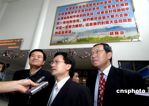 五月二十五日,由台湾民意代表陈进丁、曹尔忠、李复兴及魏明谷四人组成的台湾民意代表“小三通”考察团在福州马尾客运码头考察基础设施以及通关环境等,这是台湾决定扩大“小三通”范围后首批来到福建的考察团。中新社发 王东明 摄
