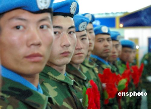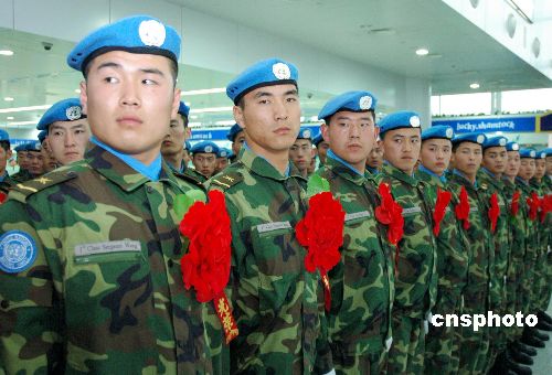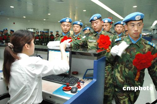 5月25日晚19时40分,济南军区第二批赴苏丹维和部队130多名官兵登机离开济南,官兵们在出征前庄严宣誓。据了解,这次向苏丹派遣维和部队,是应联合国要求,经国务院、中央军委批准,由济南军区负责组建的。中新社发 梁志杰 摄