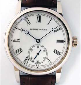 Simplicity的魅力在哪里?打一个比喻:假如把一些顶级品牌在表中的地位比作车中的劳斯莱斯,要知道劳斯莱斯毕竟还有一个商业化的流水线,而Simplicity完全就要靠Dufour和几个学徒的双手了。Philippe Dufour 在深具几何美学的1/2夹板配置下,结合极尽繁复的手工制表技艺,每一个桥板都经过仔细的倒角打磨,每一个零件都经过完美的雕琢。