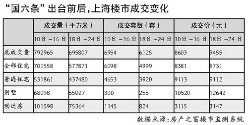 中新网5月26日电 据《每日经济新闻》报道,房产之窗楼市监测系统最新数据显示:“国六条”出台前一周(5月10日-16日)与新政出台后一周(5月18日-24日),上海全市总成交量下降9.7158万平方米,总成交套数下降829套,其中,普通住宅总成交量下降9.4381万平方米,成交套数下降733套。
