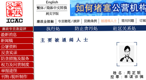 据悉,在香港廉署网页的被通缉人物名单中,排第一位的是周正毅。周正毅是因“操控证券交易价格”和“虚报注册资本”罪名成立,2004年6月1日被上海市第一中级法院判囚3年,刑期从2003年5月27日被上海市警方扣查算起,今日届满3年。