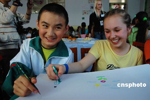 5月26日,中俄两国小学生在画画。当日,黑龙江省黑河市第五小学的千余名师生与来访的俄罗斯阿穆尔州布拉戈维申斯克市的600多名儿童联欢,共庆“六一”国际儿童节。中新社发 邱齐龙 摄