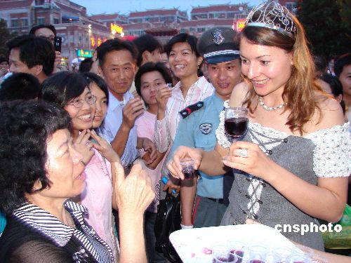 德国2005年葡萄酒皇后卡恰·施妮德小姐5月26日与泉州市民共享德国原产葡萄酒。“2006德国莱法州葡萄酒节”在泉州府文庙广场举行公众品酒会,现场多种德国原产葡萄酒供市民免费品尝。此次葡萄酒会是泉州市与德国诺伊施塔特市缔结友好城市关系十周年系列活动之一。中新社发 傅丹丹 摄