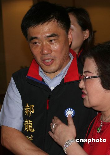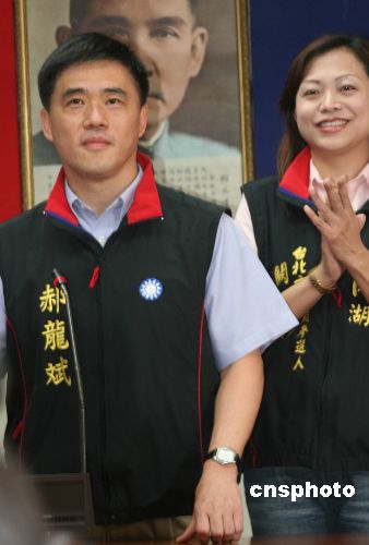 五月二十七日,中国国民党二○○六年台北市长选举提名党员投票与民意调查结果出炉。郝龙斌在此次初选结果中以百分之五十九点六八三胜出。图为郝龙斌(左)在胜出后与媒体见面。中新社发 黄少华 摄