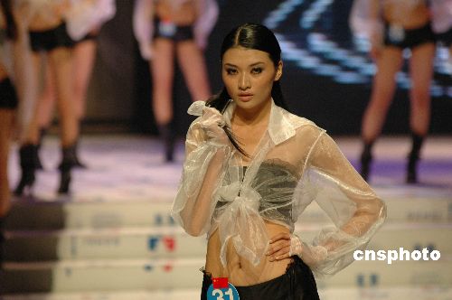 五月二十七日晚,亚洲超级模特大赛第一场决赛在广西电视台上演。模特们身着性感的内衣,热辣的日装、诱人的晚装进行比赛,极大地吸引观众的眼球。中新社发 蒋雪林 摄