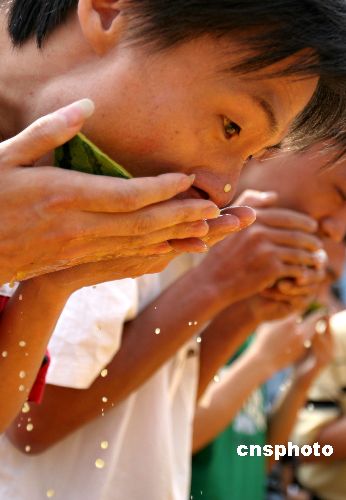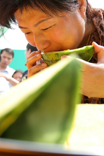 5月28日,在南京白马公园南广场举行的“第五届横溪西瓜节暨优质安全农产品展销会”上,主办方邀请市民参加啃西瓜大赛,不少市民跃跃欲试,比赛现场热闹非凡,成为夏日里一道独特的风景。中新社发 孙忠南 摄